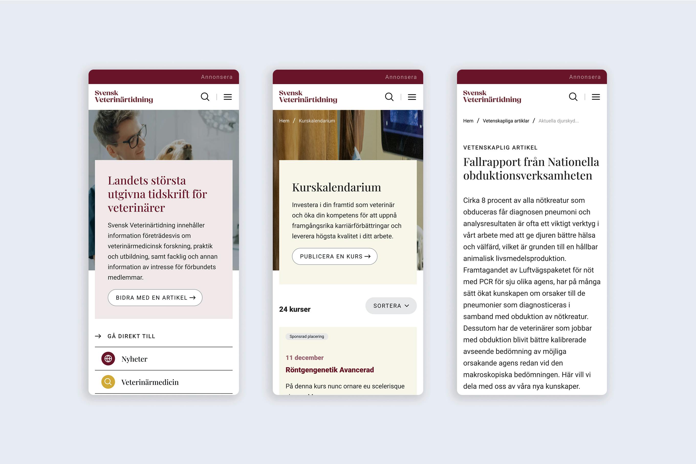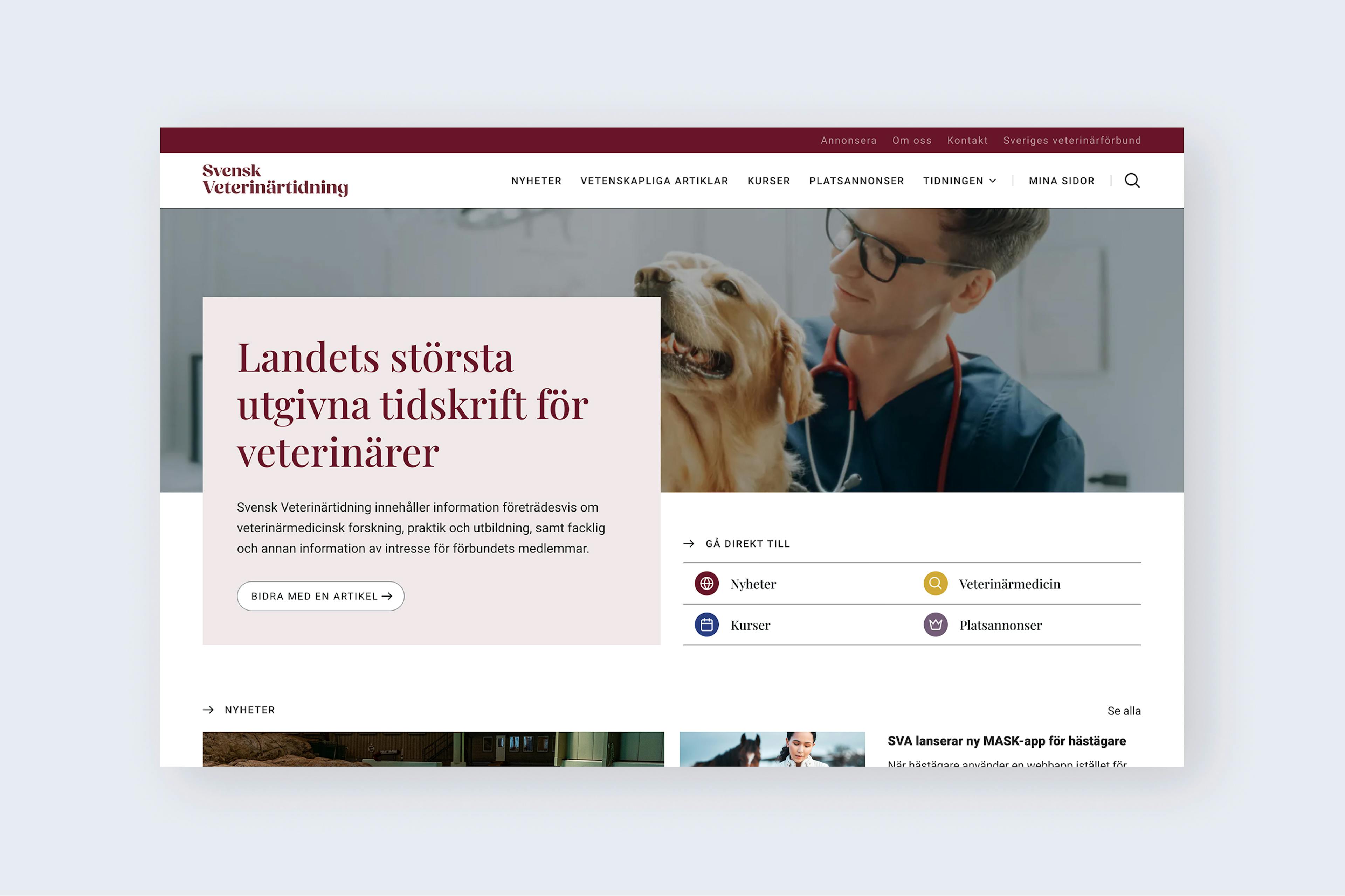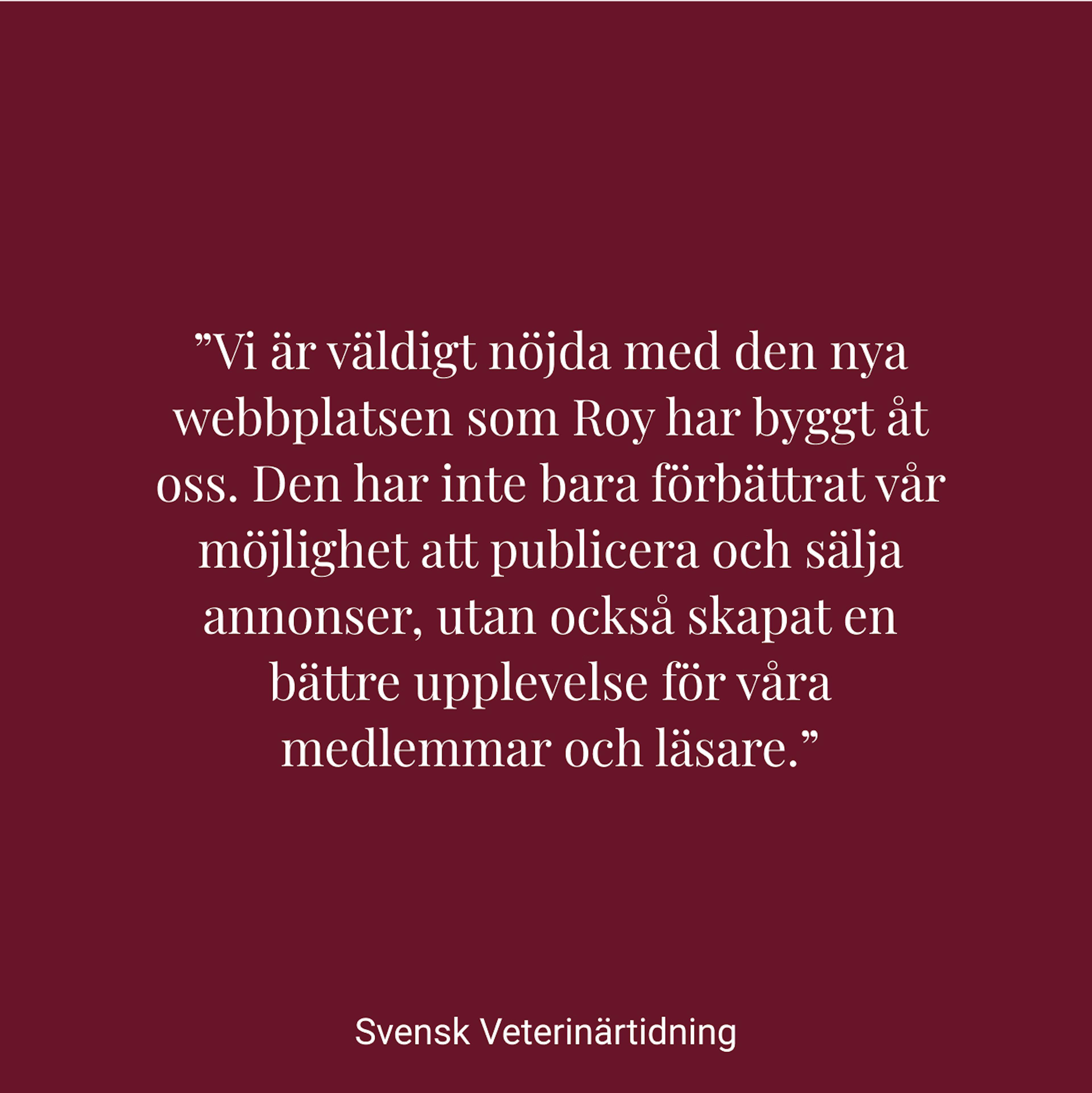 Svensk Veterinärtidning hade en gammal och bristfällig webbplats som inte stödde moderna funktioner, inklusive inloggningsfunktionalitet, flexibla annonsytor och en användarvänlig struktur för att publicera vetenskapliga artiklar. Roy fick i uppdrag att bygga en helt ny webbplats för Svensk Veterinärtidning med fokus på förbättrad användarvänlighet, modern design och integrering av nya funktioner för att stödja deras affärsbehov. Uppdraget inkluderade även en remake av den grafiska profilen och deras fysiska tidning för att säkerställa en enhetlig och modern varumärkesupplevelse.